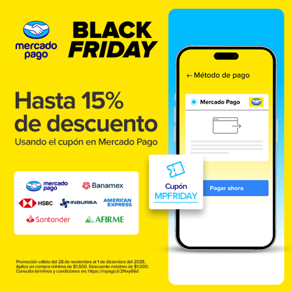 Mercado Pago Standard otorgará: un cupón de 15% de descuento sobre el monto total del Pago al usar el cupón MPFRIDAY dentro de Mercado Pago con los métodos de pago participantes